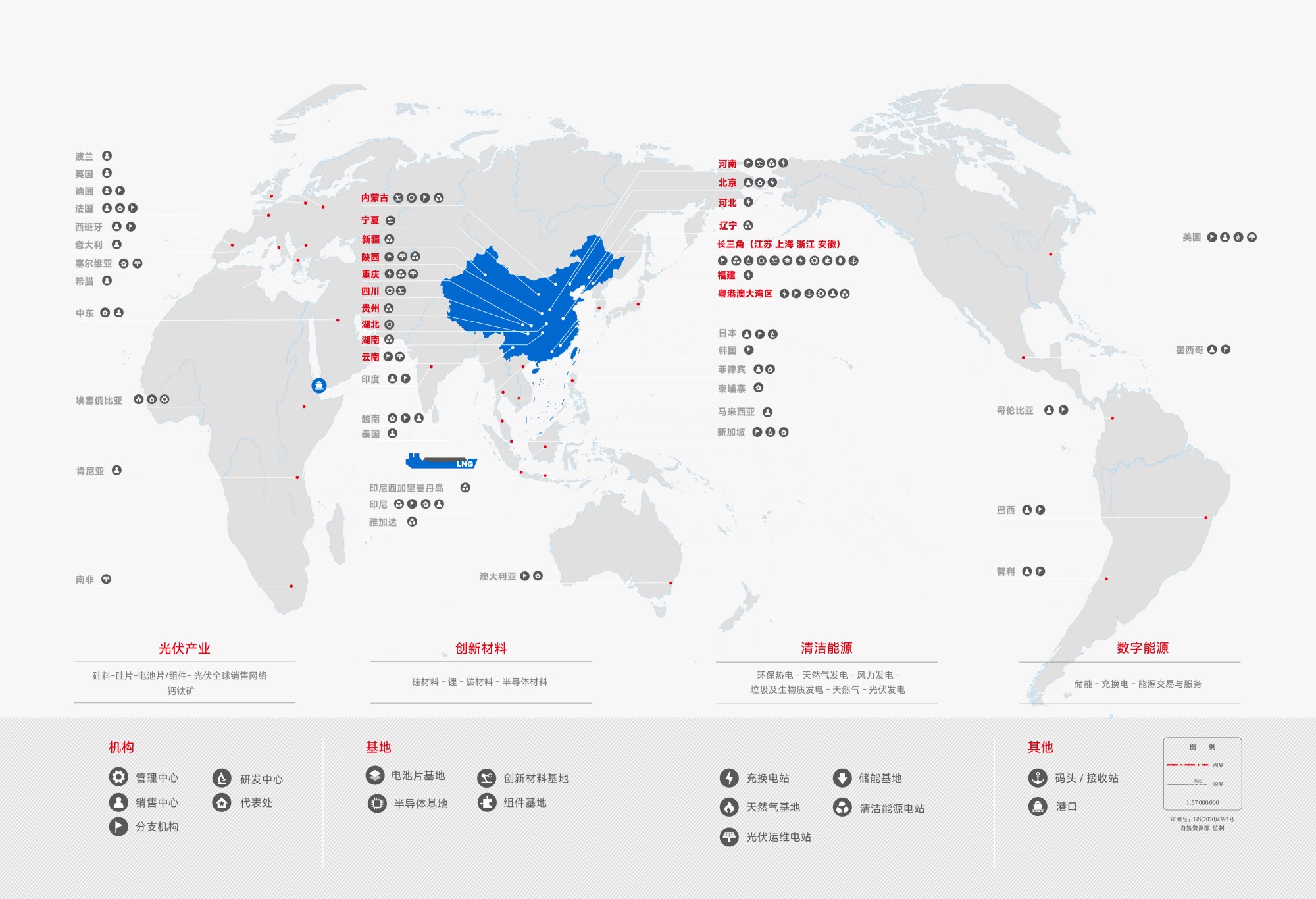 協鑫積極實施“綠色能源出?!庇媱?,研發中心、生產基地和分支機構遍布美國、日本、新加坡、印尼、埃塞、泰國、印度、澳大利亞、德國、韓國等二十多個重點國別市場以及北美、南美、中東、歐洲、中亞多國,產品及解決方案覆蓋全球70多個國家和地區,在全球多地晉升為產品全生命周期碳足跡領先的主力供應商。
